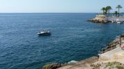 Se accede a la pequeña zona de arena a través de terrazas vecinales. Hay algunas barandillas y escaleras. Se pueden ver algunos deportes náuticos debido al embarcadero cercano.